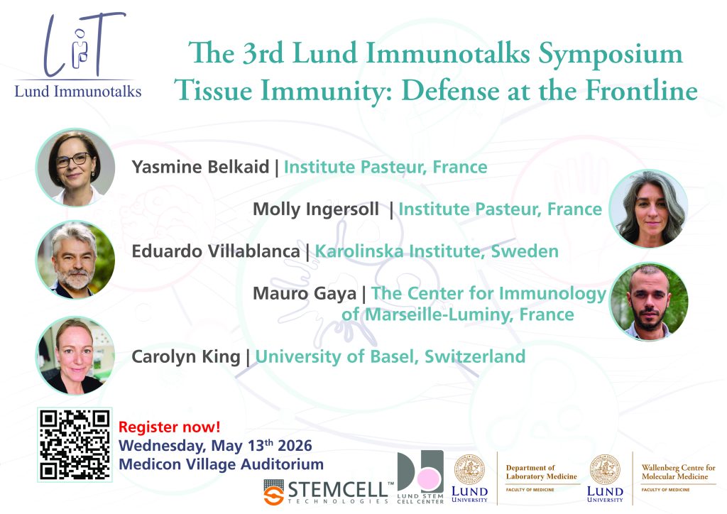 We are pleased to announce the 3rd Lund Immunotalks Symposium, which will take place on Wednesday, May 13th 2026, from 9:30 to 18:30 at the Auditorium in Medicon Village.